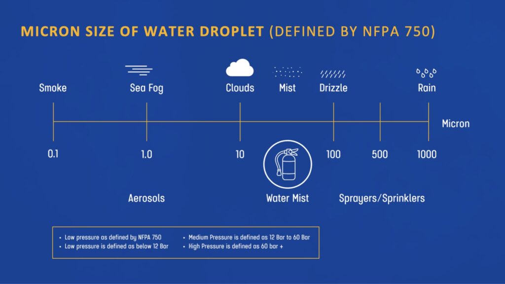 The difference between mist and spray is important and has consequences. The nozzle technology for water sprays is less advanced and so the droplet size can be up to 10 times or greater than true water mist.